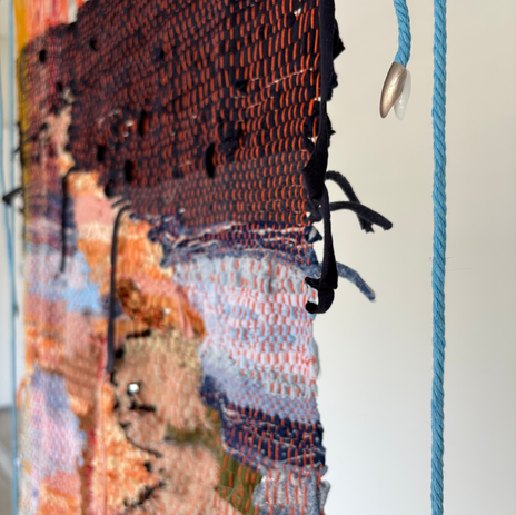 Hand-woven scraps, rope, fake nails, 2025.
